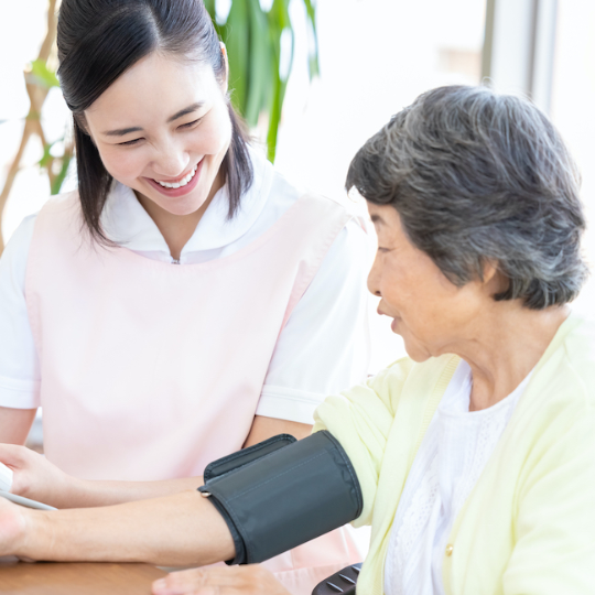 デイサービスに到着後、スタッフが血圧、体温、脈拍などを測定します。また、会話などを通して健康状態のチェックをし、柔軟にサービス内容を変更します。